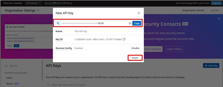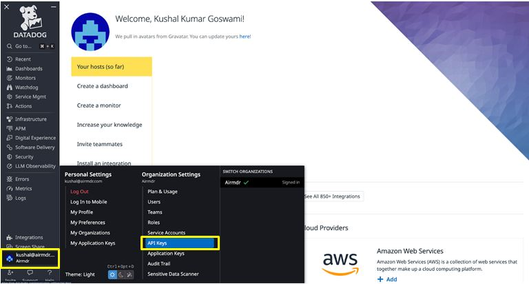 ๐ Note: API Keys are used for authentication when sending logs, metrics, and traces to Datadog.