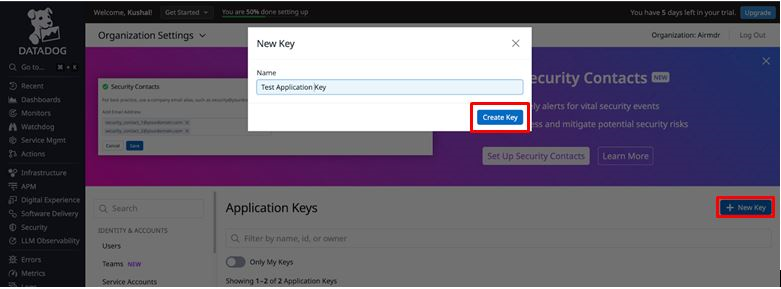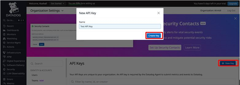 Only users with an Admin or Standard role can create new keys.Generate Datadog API Key and Application Key