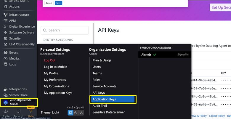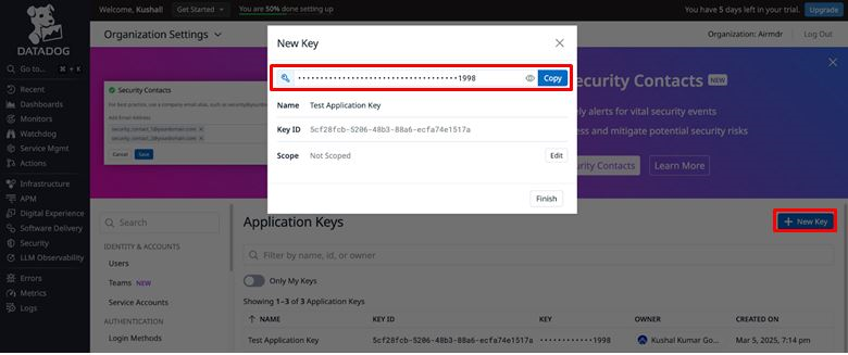 ๐ Note: Application Keys are used for making authenticated API requests to Datadog (e.g., retrieving logs, dashboards, or managing configurations).