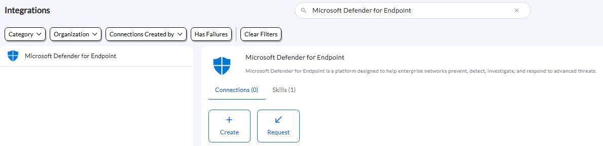 Use the search option, enter the keyword โMicrosoft Defender for Endpointโ, select the Connections tab, and click the + Create icon.
