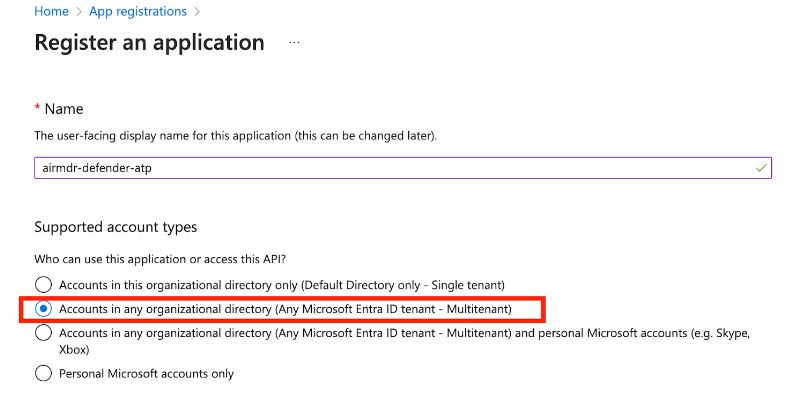 airmdr-defender-atp). - Supported Account Types: Select โAccounts in any organizational directory (Any Microsoft Entra ID tenant - Multitenant)โ option).