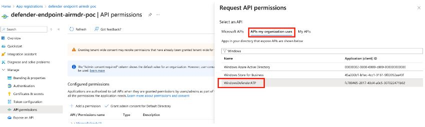 Alert.Read.All,File.Read.All,IP.Read.All,Machine.Read.All,SecurityRecommendation.Read.All,Software.Read.All,URL.Read.All,User.Read.All,Vulnerability.Read.All,Alert.ReadWrite.All,Machine.ReadWrite.All). - Click Add permissions at the bottom of the page.