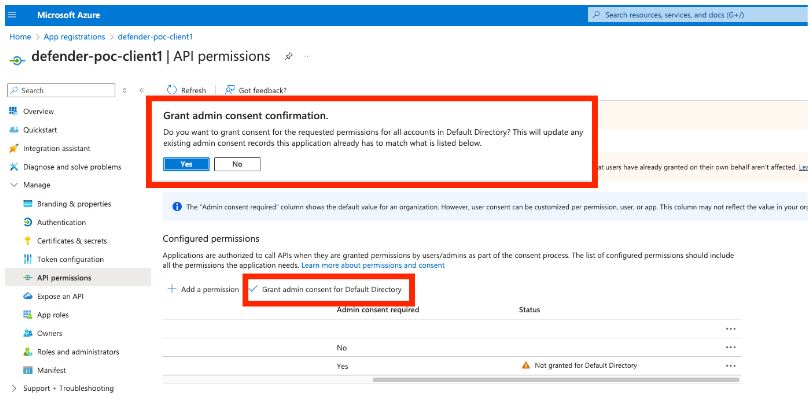 Click API permissions, select Yes for Grant admin consent confirmation to allow access.