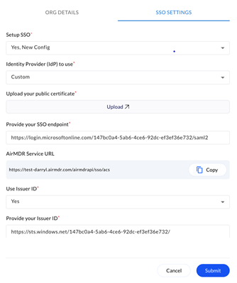 SAML (Security Assertion Markup Language) integration with Azure AD enables Single Sign-On (SSO) functionality. This allows users to access multiple applications with just one set of credentials by securely transferring authentication and authorization information between Azure AD (the Identity Provider) and AirMDR (Service Providers).Pre-requisites