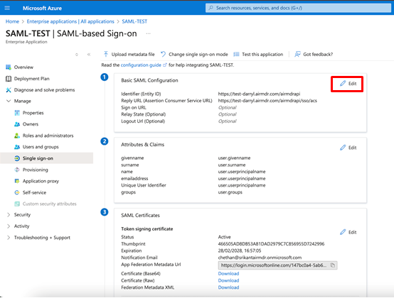 - In the “SAML Signing Certificate” section, download the “Certificate (Base64)” or Federation Metadata XML.